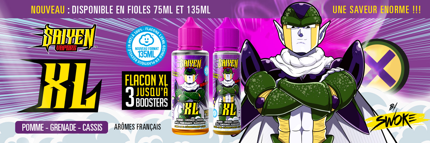 XL est la première référence de la gamme Saiyen Vapors a être proposée en 100ml dans un flacon 135ml Ozone®, un format inédit qui attire l’attention et crée un véritable effet nouveauté en point de vente. Il bénéficie d'un concept innovant permettant d’ajouter jusqu’à 3 boosters directement dans le flacon, simplifiant l’usage et favorisant les ventes additionnelles. La qualité aromatique reste constante, avec une restitution fidèle des saveurs fruitées, le tout dans un flacon écoresponsable.