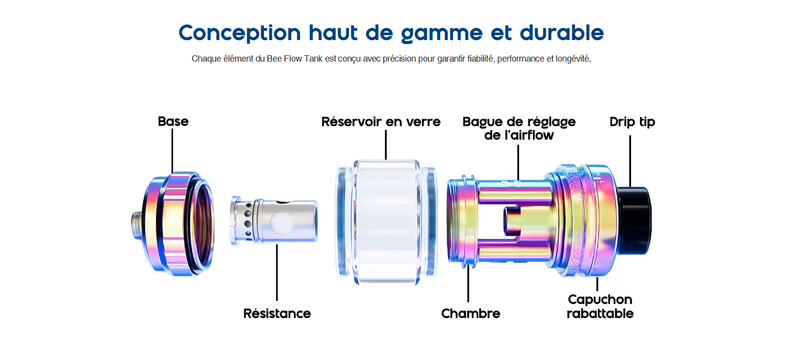 Grâce à sa capacité de 5 ml, le Bee Flow Tank assure une autonomie confortable pour profiter pleinement de longues sessions de vape.