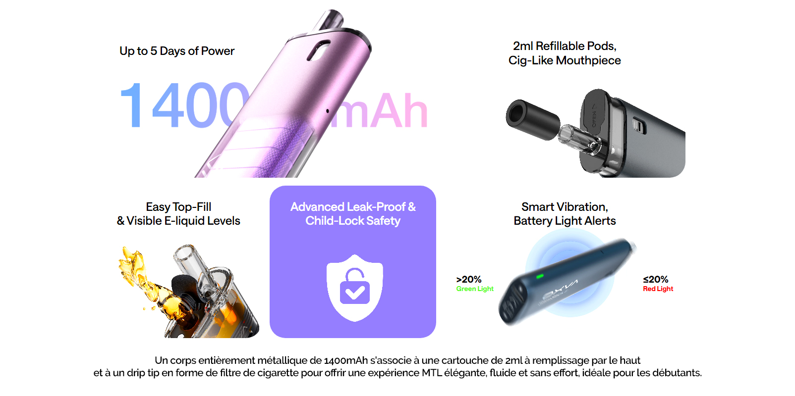 Équipé d’une batterie intégrée de 1400 mAh, ce pod assure une excellente autonomie pouvant atteindre plusieurs jours d’utilisation.