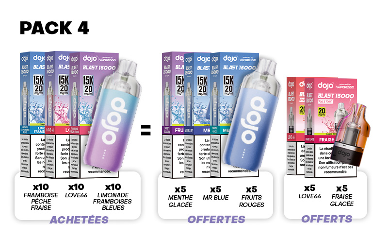 Pour l’achat de 30 kits Dojo Blast 15K, bénéficiez de 15 kits supplémentaires offerts ainsi que de 10 cartouches Dojo Blast 15K offertes. L’offre est disponible en 4 packs de saveurs différents, vous permettant de sélectionner la combinaison la plus adaptée à votre clientèle parmi les saveurs disponibles.